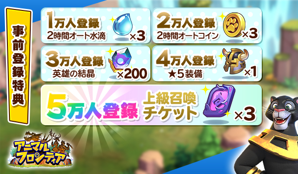 [事前登録] アニマルフロンティア 放置ストラテジーRPG アニマル達の熱い戦いがはじまる! 放置モードでアニマル達が強くなり続けるストラテジーRPG! fa-bell 事前登録の特典 事前登録人数に応じて、豪華アイテムが貰える!! ▼10,000人突破 2時間オート水滴×3 ▼20,000人突破 2時間オートコイン×3 ▼30,000人突破 英雄の結晶×200 ▼40,000人突破 ★5装備×1 ▼50,000人突破 上級召喚チケット×3